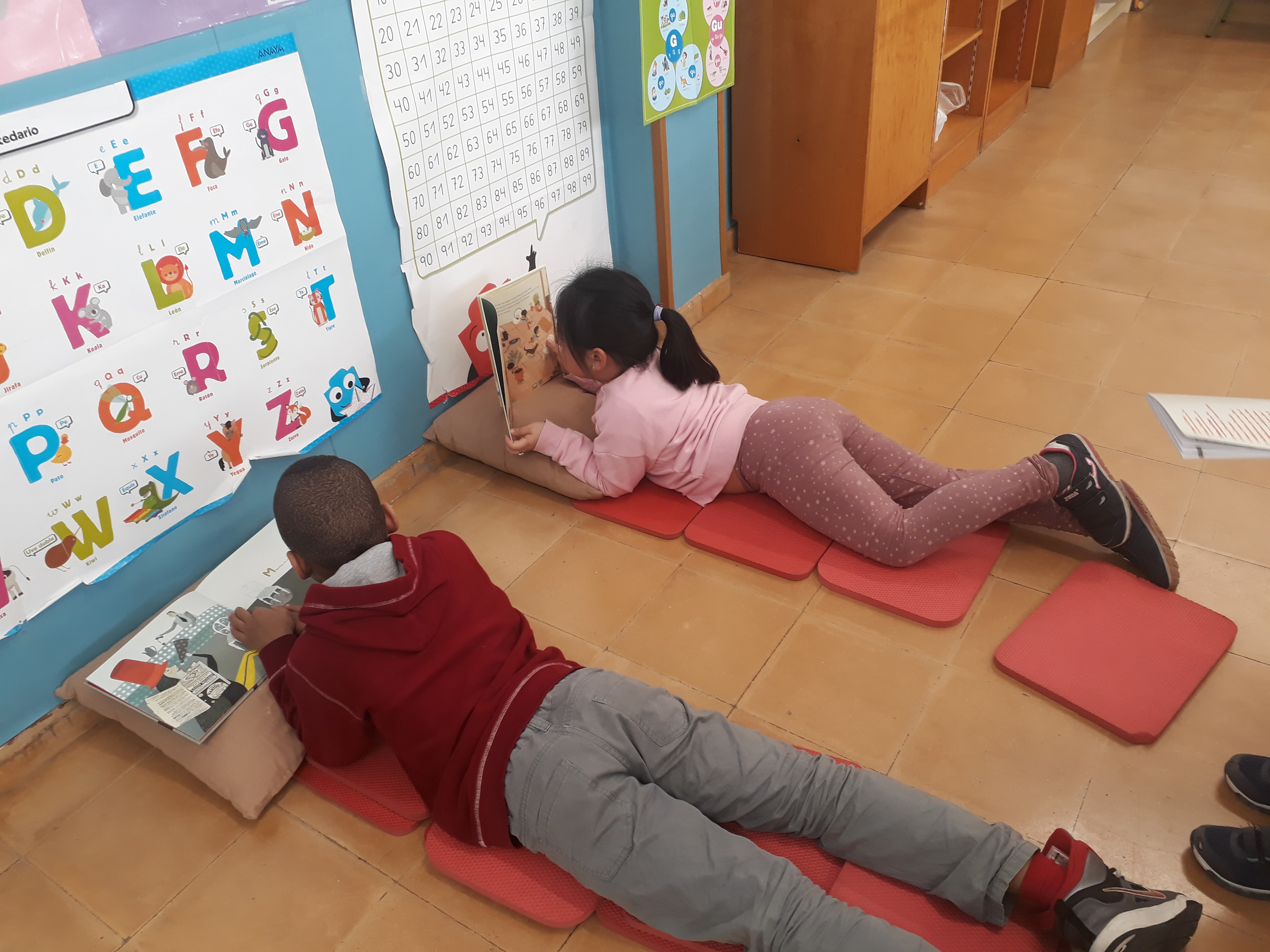 Merche, la profe de religión, nos ha regalado unos cojines y ahora disfrutamos muchísimo de los ratitos que tenemos para leer un cuento nosotros solitos.